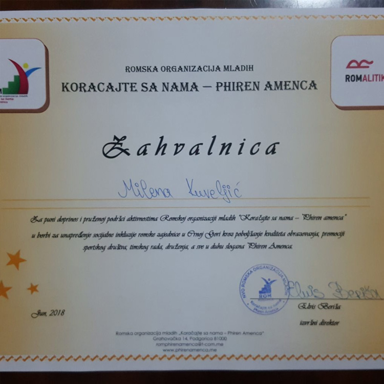 Mladim aktivistima i volonterima koji su učestvovali na obukama i akcijama koje je Phiren Amenca realizovala u prvoj polovini 2018. godine dodijeljeni su Sertifikati i Zahvalnice za pružanje doprinosa organizaciji.